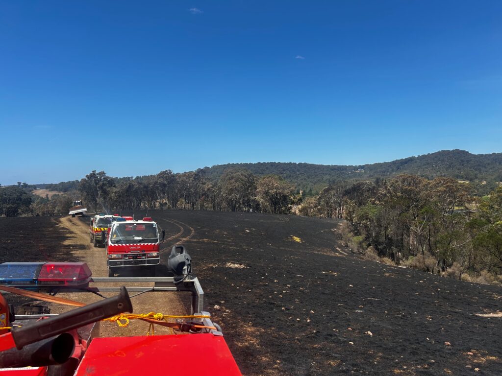 At approximately 4.30 pm on Tuesday 9 December, 2025, a fire was reported in grassland paddocks at the southern end of Hawkshill Road. The property’s owner and a number of contractors working on the site tried to extinguish a small grass fire, however, prevailing south-easterly winds quickly pushed the fire further into the dry grass paddocks triggering an emergency response. RFS crews were soon in attendance with a focus on securing the fire and containing the flanks.